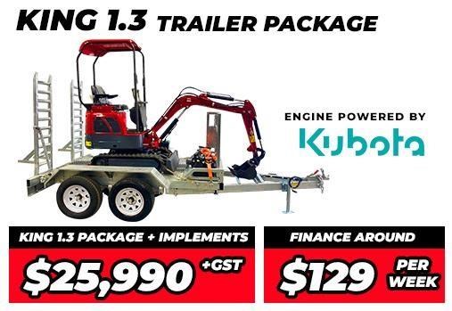 1.3 Ton Excavator, Implements and Trailer Premium Package Only $25,990+GST or around $129 per week on finance - Swing Boom - Kubota Engine - 200mm Narrow Bucket With Teeth - 400mm Standard Bucket With Teeth - 500mm Batter Bucket - Ripper - Grab - Claw - Quick Hitch - Super Duty Trailer with 4 wheel electric brakes and easy fold down ramps - Implement rack - Tie down straps - All set up for you turnkey - Add an optional auger with 200 mm bit for $1990 + GST - 12 month parts and labour, 36 month parts warranty - Easy to apply, no deposit and financing available- Digger King 1.3 from just $89 per week, all done via experienced finance teams that search for the best deal for you. From the first day you own your new digger, no dodgy overpriced rent-to-own options - Able to dig down to 1650mm - this means most trenches will be done with ease - Large deep grip tracks- this allows you to grip in the most sticky situations - Small Operating area - this allows you to access areas easily - Easy to use controls - this means it is simple to operate - 2365mm maximum height - means you can load trucks or pile things up higher and easier - Easy to operate and accessible controls - Operate your King 1.3 in comfort - Reliable and strong - your King 1.3 is built strong, as strong as bigger brand name diggers but without the pricetag - 3-minute on pre start check - yes, simple and easy to access, walk around, check oil, water and attachments in 3 minutes or less - King comfy seat - this gives you comfort when operating all day - Easy clean floor - getting mud off the floor is easy, clean with no hassles - Quick release bucket - adds to the speed, if you need to remove the bucket it is fast, easy with no fuss - Adjustable level blade - you can adjust and level out ground in front of you - All round vision - nice and handy to see around you when backing up - High grip handles - walk in and out easily with a high grip handle within easy access; this means even on rough ground you can get back on board with no issues - 12 month parts and labour, 36-month parts warranty - Your investment is safe and secure. If you have any dramas with workmanship on your digger or anything in your digger, let us know and we will sort it out as quickly as we can - Dedicated after-sales help and support - 1300 direct line to our help staff. Got a question? We are happy to help - Easy add-on equipment - Select from our range, we will fit it to your digger for you or supply your own and you can fit it when your digger arrives XL Digger Tipper Trailer Package Upgrade $5,990 + GST or around $29 per week on finance, or buy outright (without digger + trailer package) for $12,990+GST or around $69 per week finance - Upgrade your standard trailer package to the XL digger tipper including: - Specialised removable implement rack - easy to lift out implement rack without having to reach over or remove the cage every time you need to change implement on site - Removeable cage - allows you to easily unbolt the steel cage so you can use your trailer at 2 different heights, depending on your job - Built in ramps - stored underneath the trailer for simple loading and unloading of your machine - Remote controlled hydraulic tipper with 5 stage ramp - heavy duty tipper with easy to access hydraulic lines, battery and remote so maintenance is as simple as possible - Extra heavy duty reinforced floor - allows you to tow your machine and implements safely and easily, or use the trailer for tipping dirt, timber, gravel etc - Hot dipped galvanised steel trailer - ensuring longer lifespan of your trailer as we only build premium hot dipped galvanised steel Engine Engine Make Kubota 3 cylinder Fuel Type Diesel Rated Power 14 hp (10.2 kw) Electrical 12 Volt Hydraulic System Pump Brand Jinxing (USA Design) Valve brand Beifang (USA Design) Pressure 2610 PSI (180 Bar) Flow 18 L/Min Cooler Air Driving System Motor Brand Eaton (USA) Pressure 2610 PSI (180 Bar) Flow 18 L/Min Speed 1.5 Km/h Fluid Capacities Fuel 11 L Diesel Hydraulic Oil 15.3 L Engine Oil 2.8 L Specifications Load capacity - 200 kg Weight - 1220 kg Width - 930mm Dimensions - 2120 mm (L) x 930 mm (W) x 2210 mm (H)